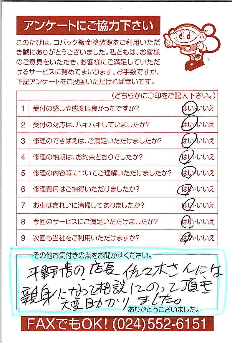 少しでも安くといろいろ提案してくださりありがとうございました。車もきれいに修理してあり感謝です。今後は気を付けて運転します。車検時にまたお世話になります。本当にありがとうございました。