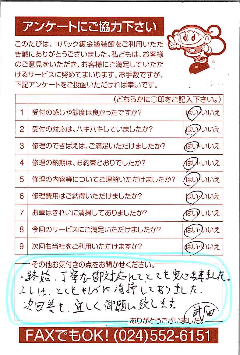 きれいに仕上げて頂き満足しております。洗車・清掃もして頂きありがとうございました。
