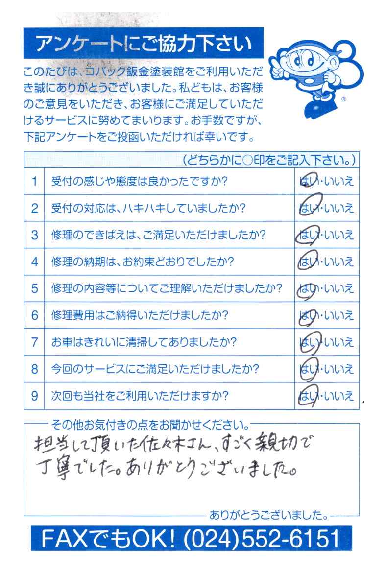 担当していただいた佐々木さん、すごく親切で丁寧でした。ありがとうございました。
