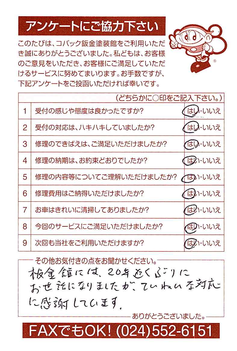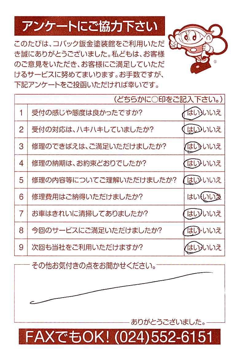 少しでも安くといろいろ提案してくださりありがとうございました。車もきれいに修理してあり感謝です。今後は気を付けて運転します。車検時にまたお世話になります。本当にありがとうございました。
